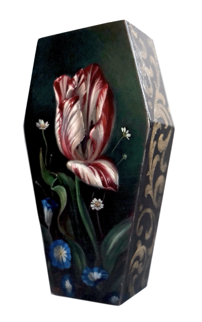 ‘Coffin Tulip’ 2024 Oils on Custom Coffin Panel 9.5 × 17.5cm